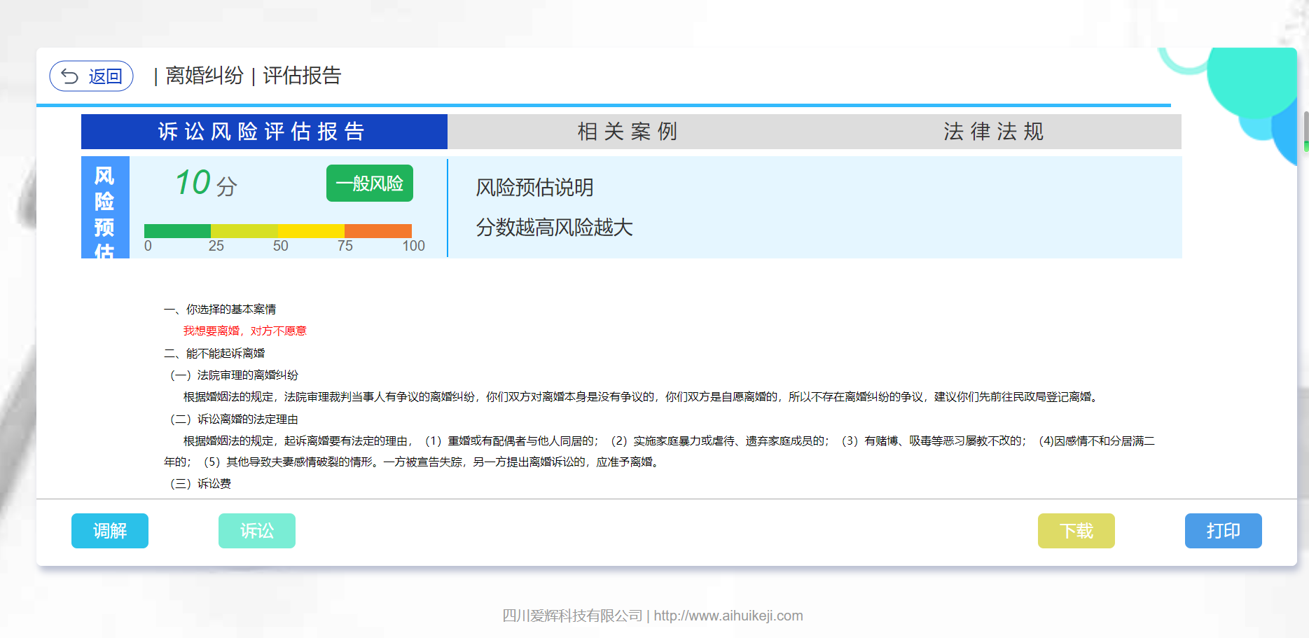 系统根据当事人的风险问答项从感情、时间、金钱、信誉等多方面进行风险描述,并为当事人提供报告打印功能;