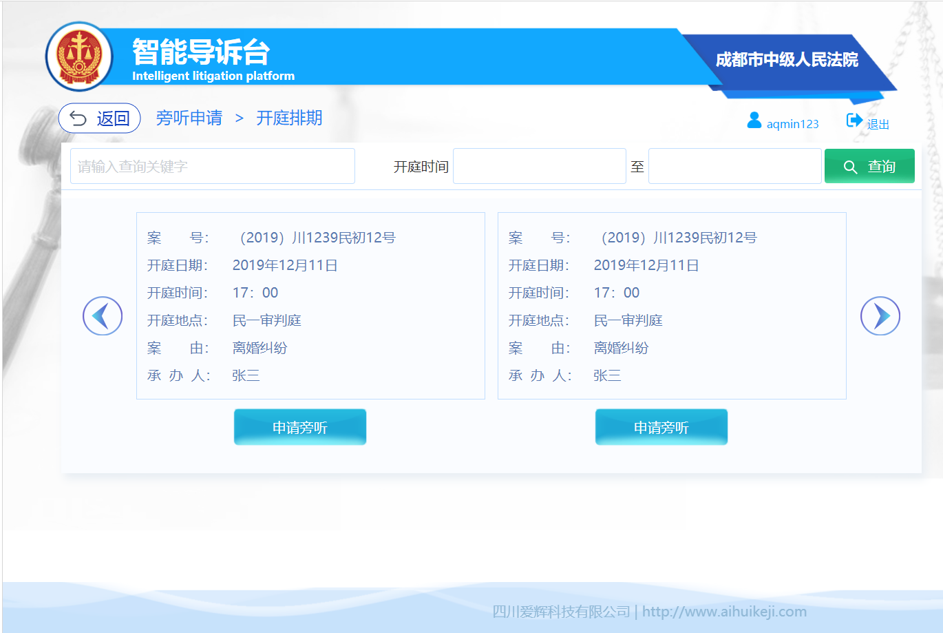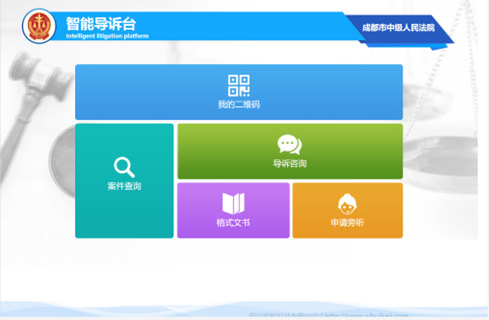智能导诉台为当事人提供身份鉴权,自助导诉咨询,案件查询,法院格式文书,开庭公告,旁听申请以及后端数据管理为法院提供全方位诉讼服务。