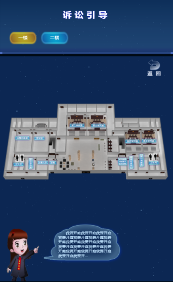 在诉讼引导界面,可展示每个楼层、每个区域的窗口,多区域地图,所有可公开地点集中展示,清晰的展示出地图的3D效果,并且通过语音和动画的效果进行导诉,可灵活的配置语音介绍的智能文字。