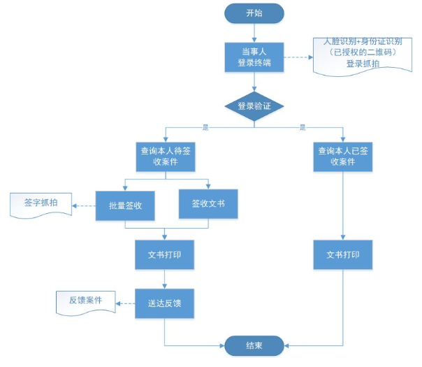 当事人需要通过身份证以及人脸识别进行唯一性、真实性验证后才能登录系统,如果人证不相符合则无法进入系统签收送达文件。另外如果配备了导诉系统,则能够直接通过导诉台二维码登录系统。