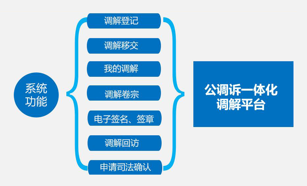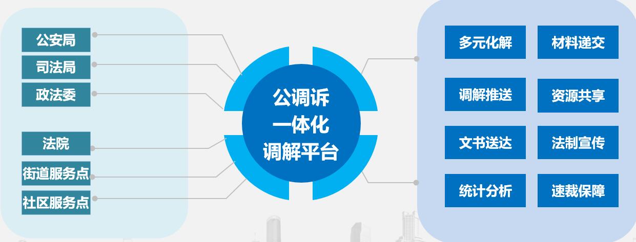 公调诉一体化调解平台采用线上线下相结合的方式,建立线下调解、调解协议书自动生成、线上申请司法确认、调解书在线送达等为一体的调解平台。其纠纷调解功能延伸至泸县司法局、政法委、法院、街道服务点、社区服务站,以及辖区内的人民调解员、专业调解组织、司法局调解员、社区调解员、民警等,真正实现纠纷防范的全覆盖。